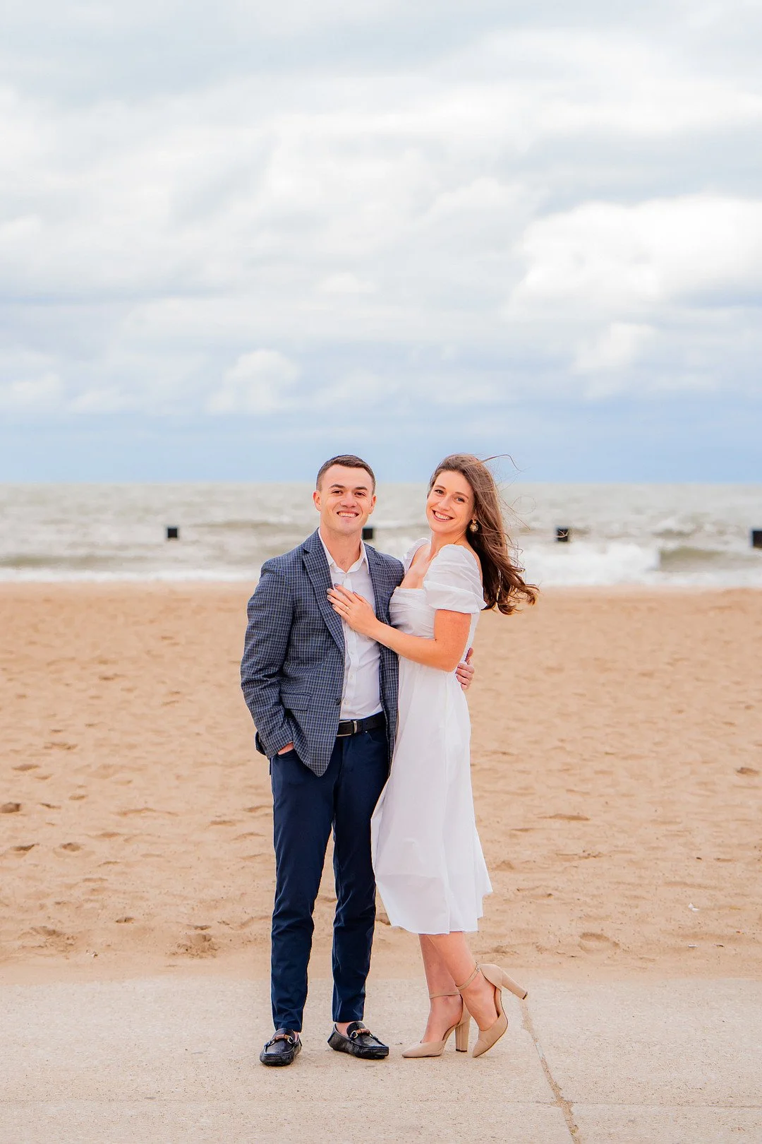 The catch?! It was COLD. Cold and windy! But instead of shying away from this blustery day, Hannah threw on an Old Hollywoodesque faux fur coat and the two bravely clasped hands and truly blew me away! We had the entire pier and beach to ourselves (one of the perks of having a colder weather engagement session) and, while these two are obviously gorgeous with amazing chemistry to boot, the sky came very close to stealing the show! Stunning clouds gathered over the skyline while the wild waters of Lake Michigan danced beneath our feet.