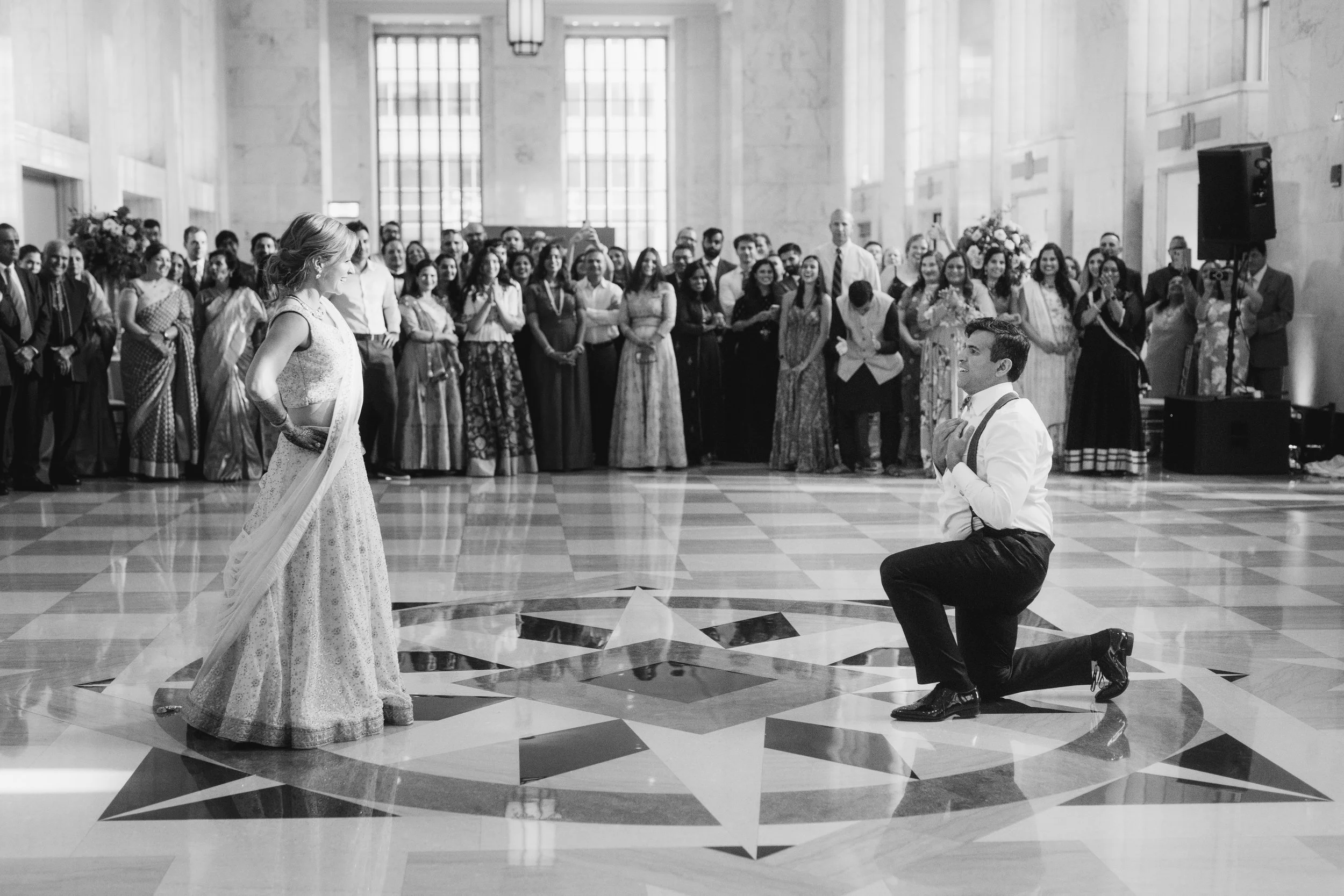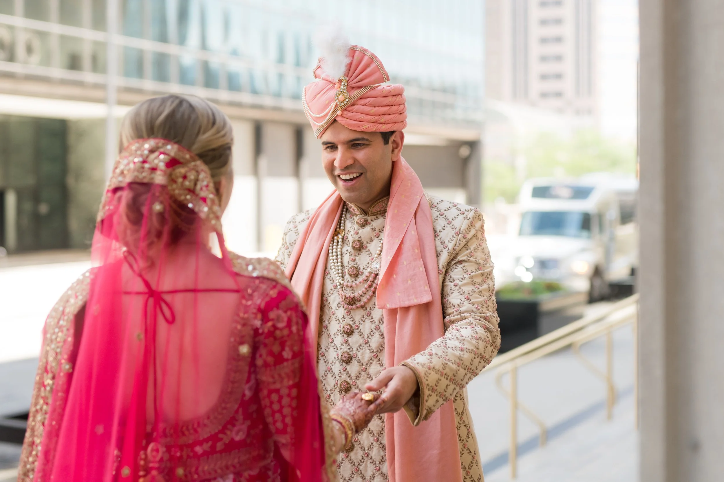 We both had different visions for the wedding until we stepped into the lobby of the Post Office – we knew immediately this was our wedding venue. Even though it was still under construction and we were viewing it in hard hats we could see how incredible the space was and everything it had to offer. From there, we built our vision around integrating the natural beauty of the building with the cultural nature of an Indian wedding. We wanted it to be simple, elegant and of course colorful. When it came to picking the color scheme it was easy…..we both have the same favorite color: pink!!!