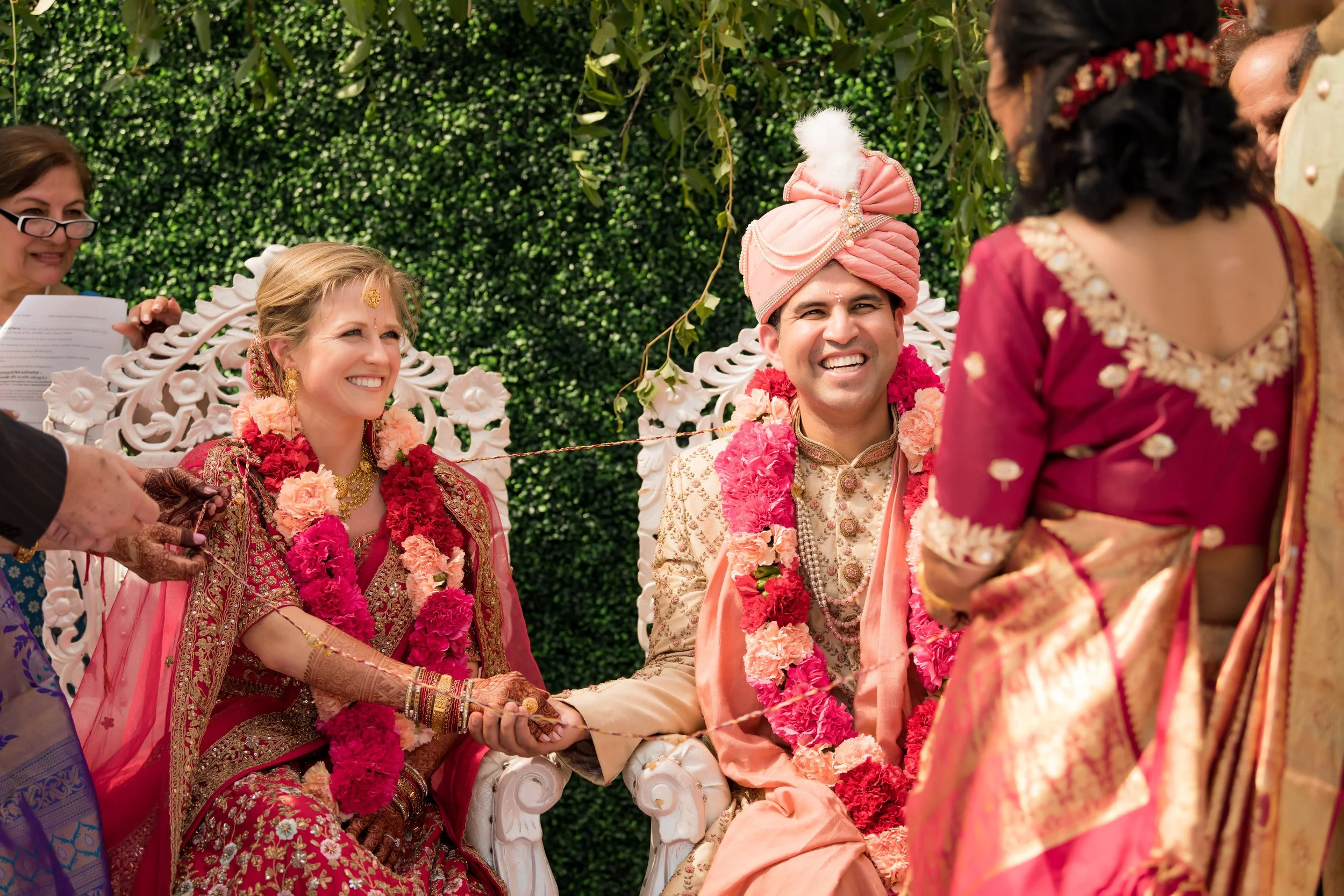 Emily's father then escorts her to the mandap (in accordance with western traditions; in a traditional Hindu wedding, the bride’s uncle escorts her to the mandap). As she enters a veil is held in front of Ankur to denote the couple’s status as separate spiritual beings. Once Emily enters the mandap the veil is removed and Ankur and Emily exchange flower garlands which symbolizes their acceptance as life long partners