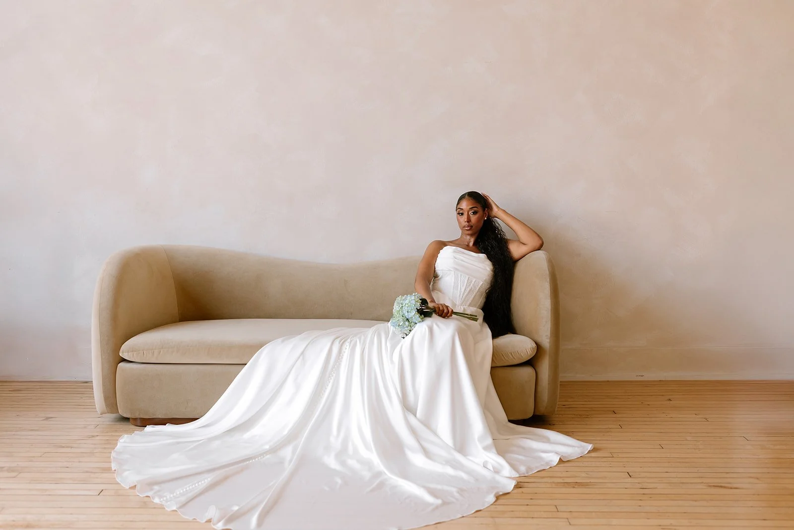 Offered in both ivory and a striking blue, Virginia reimagines traditional fabrics with elevated texture and depth. It’s not lace, it’s not plain satin, it’s something else entirely.